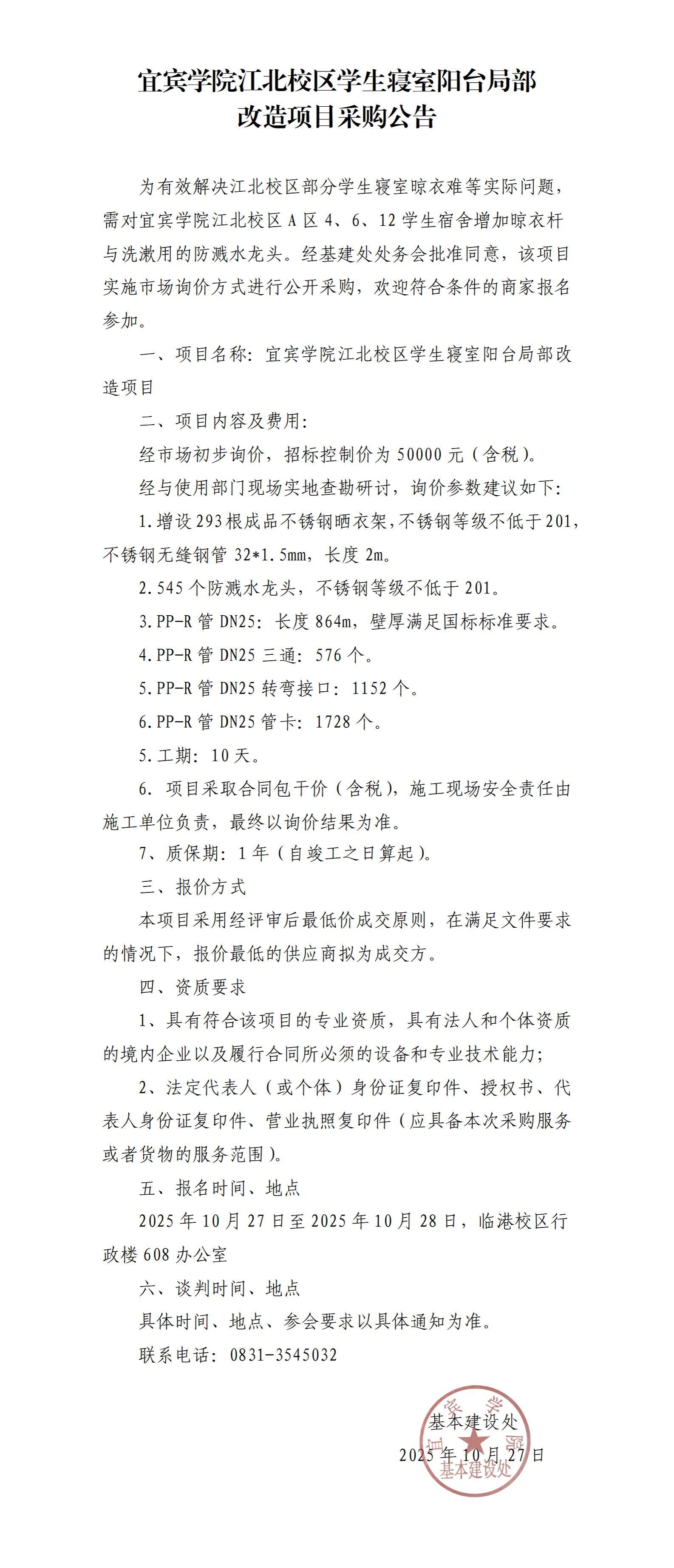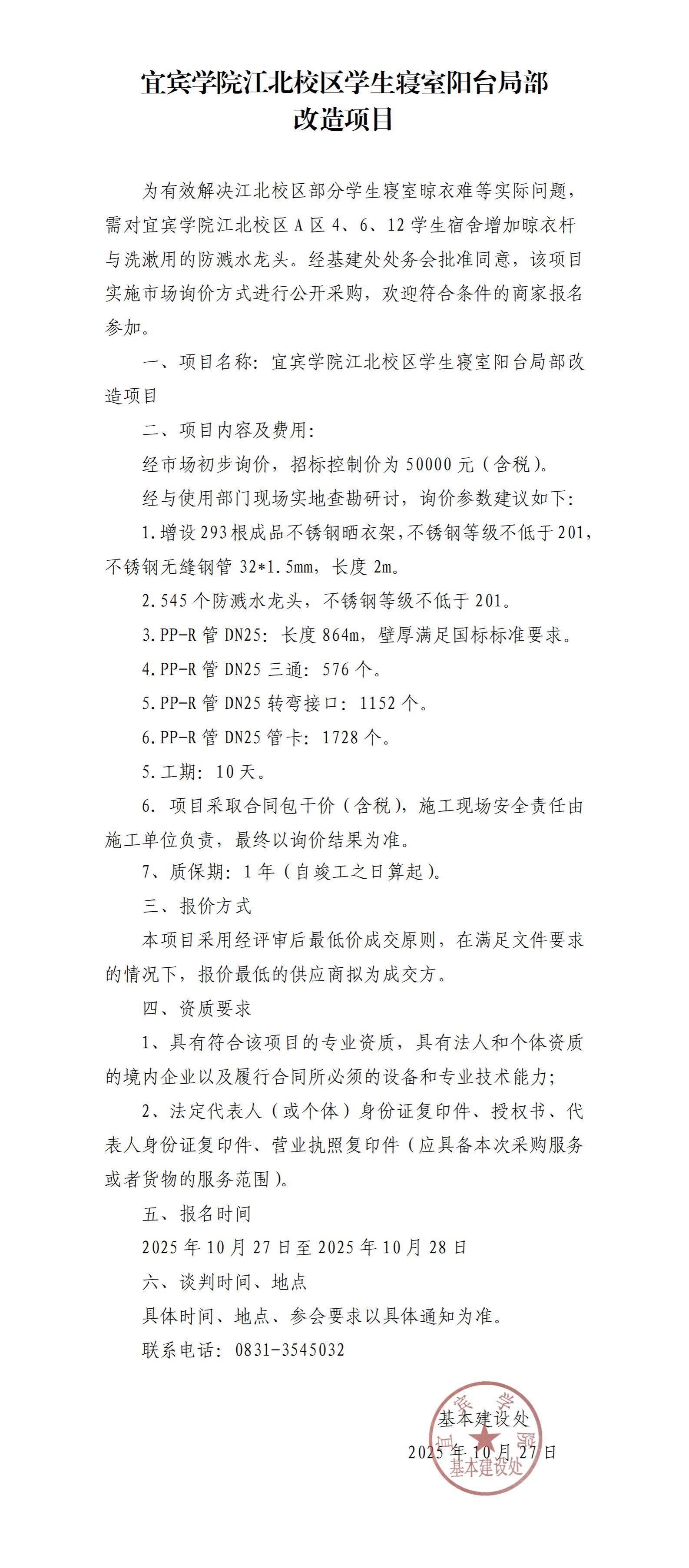 宜宾学院江北校区学生寝室阳台局部改造项目采购公告